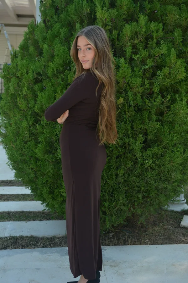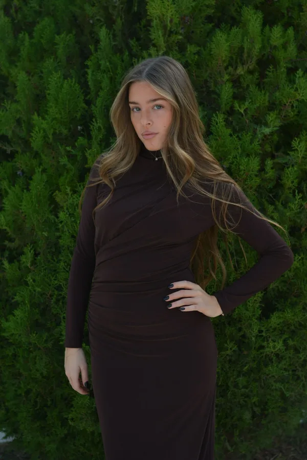 שמלת נואל בגוון חום שוקולד בעיצוב אלגנטי ומחטב.