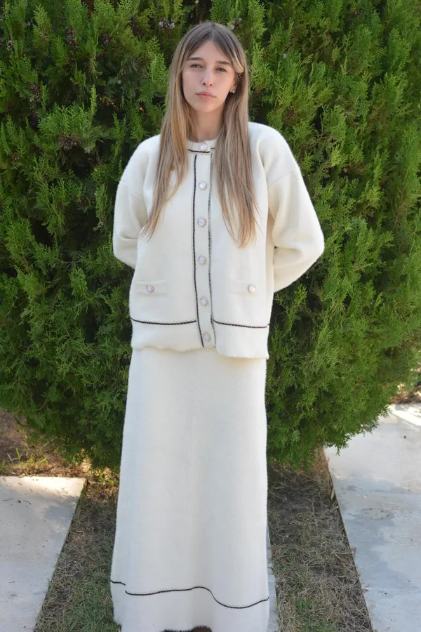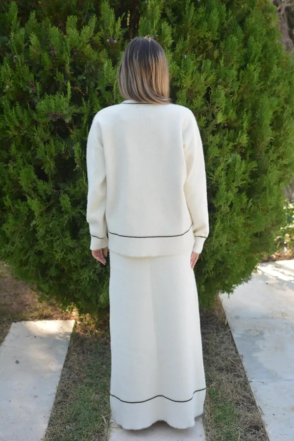 סט סריג מוקפד הכולל חצאית וחולצה בגוון לבן רך