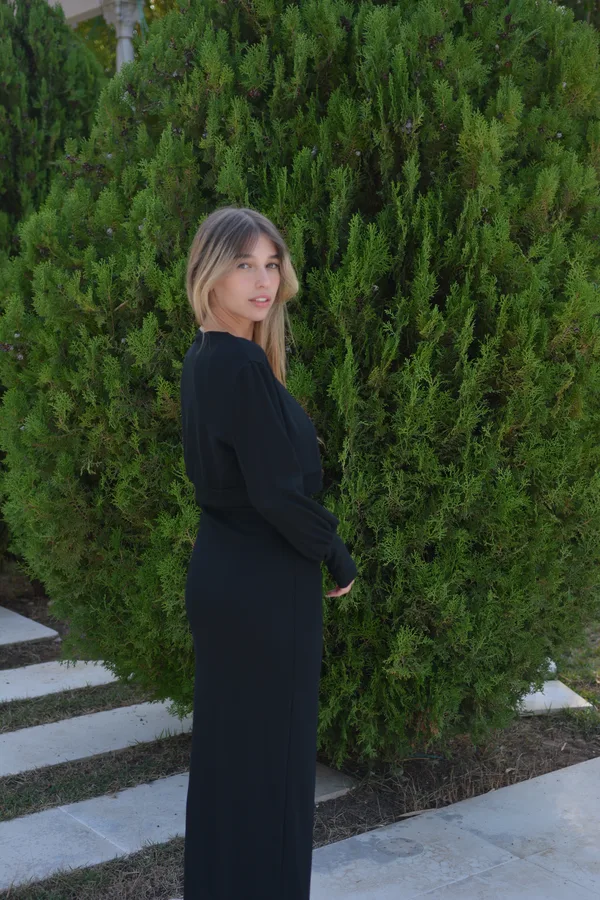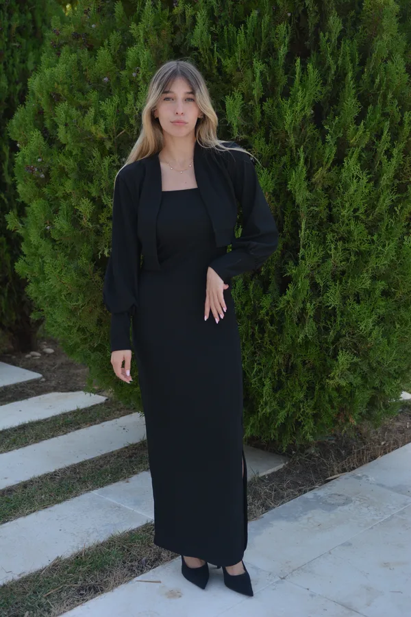 חליפת שני חלקים בגוון שחור קלאסי – שמלה בשילוב ג׳קט קצר